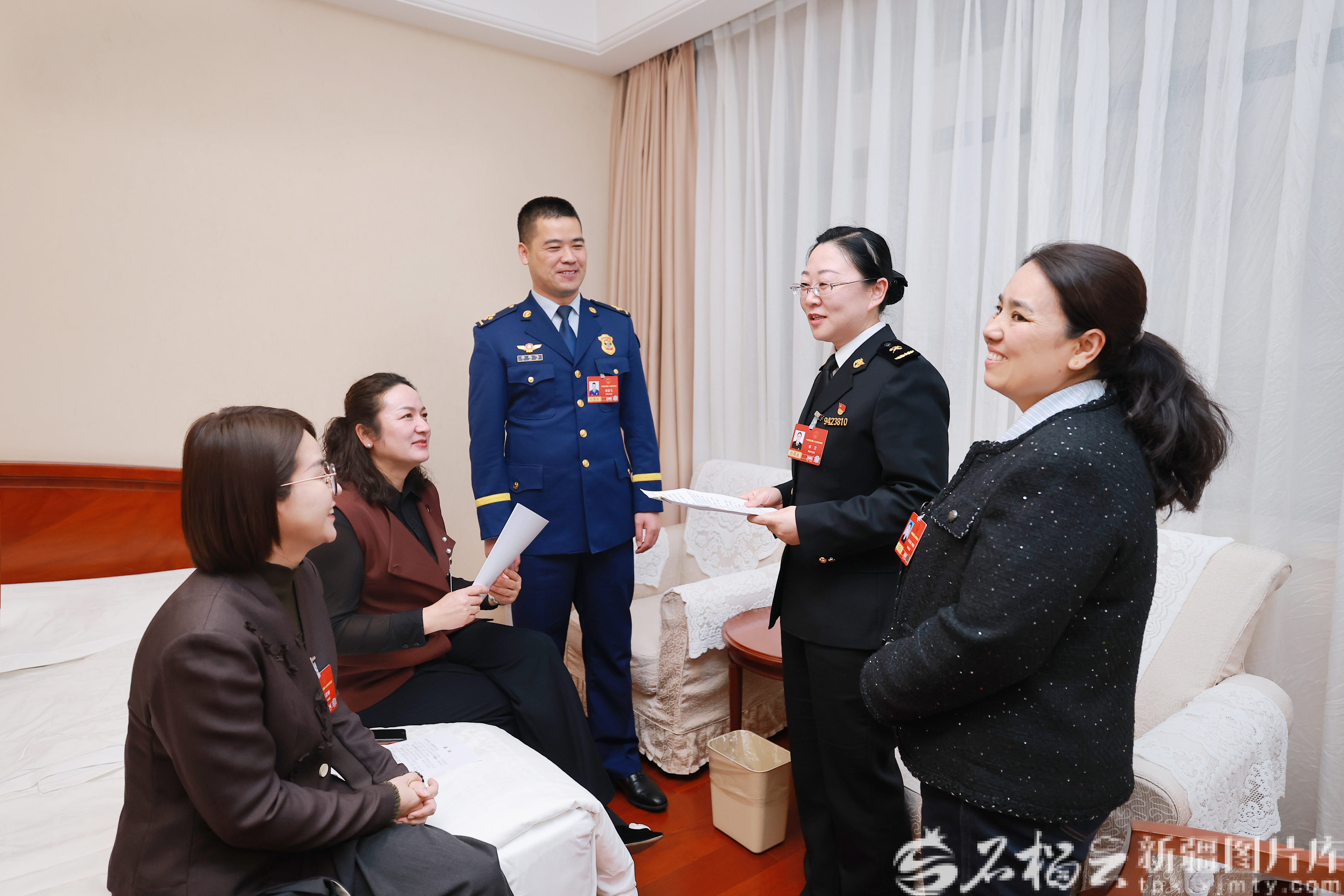 3月4日,李兰(右二)在驻地就推动陆路边境口岸标准化规范化建设、助力中欧班列高质量开行等发言内容和其他代表交流。天山网-新疆日报记者 崔志坚摄