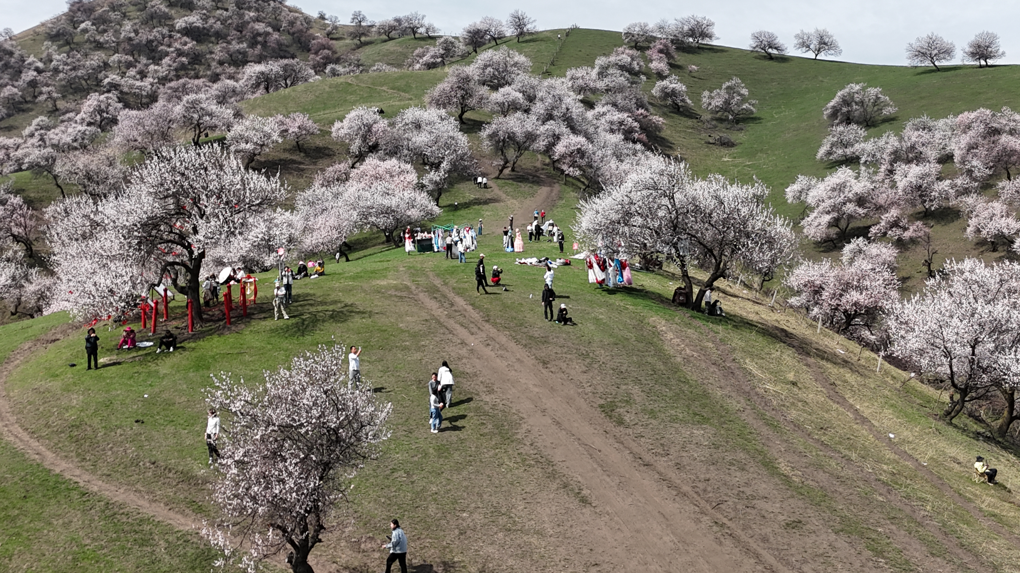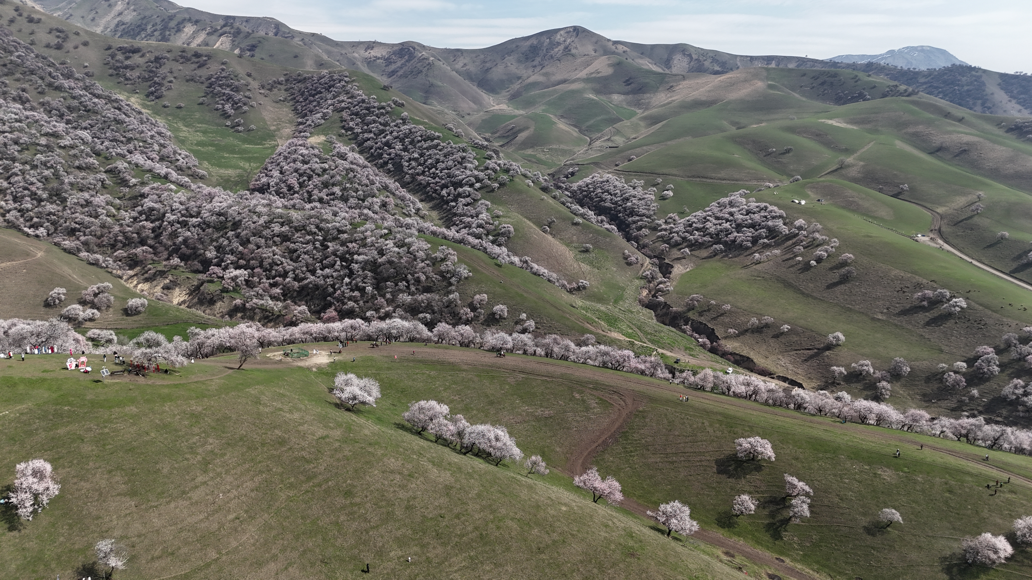 4月2日,新源县那拉提杏花谷,漫山遍野的野杏花层层叠叠、竞相绽放。粉白相间的花瓣随风轻舞,与茵茵绿草、连绵远山相映成趣,勾勒出一幅如诗如画的春日盛景。游客们漫步花间、驻足打卡,在清新的空气中沉醉花海,尽享踏青赏春的惬意与美好。